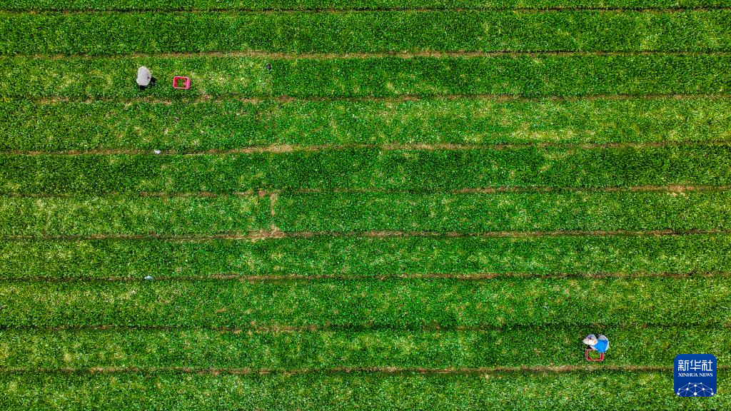 5月24日,工作人员在宁夏贺兰县立岗镇银星村一冷凉蔬菜种植基地采摘菜心(无人机照片)。