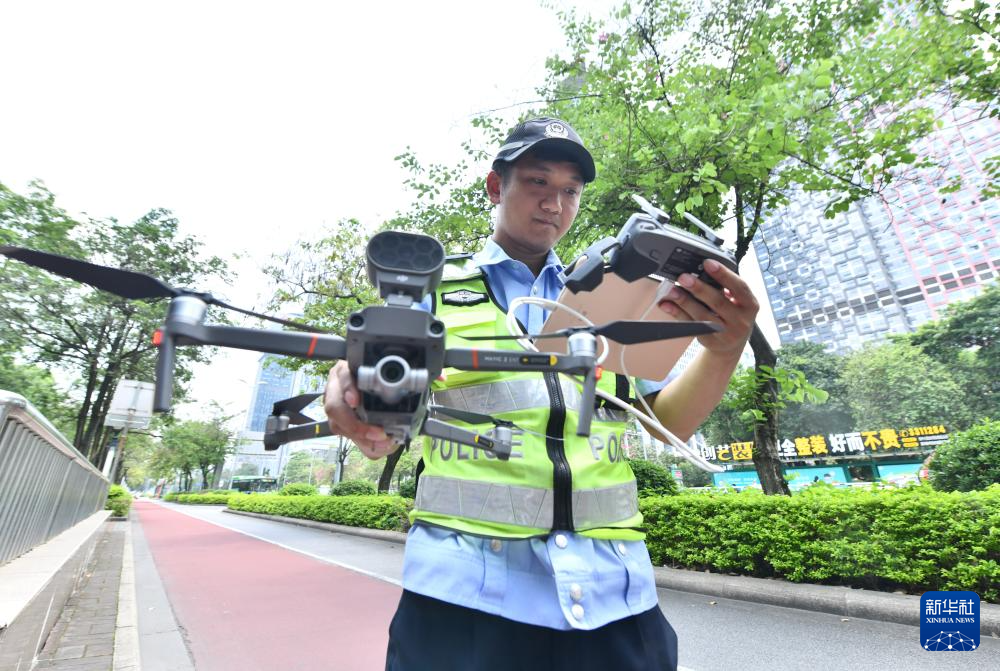 在柳州市桂中大道,交警准备用无人机对道路进行巡查(5月24日摄)。