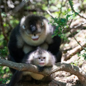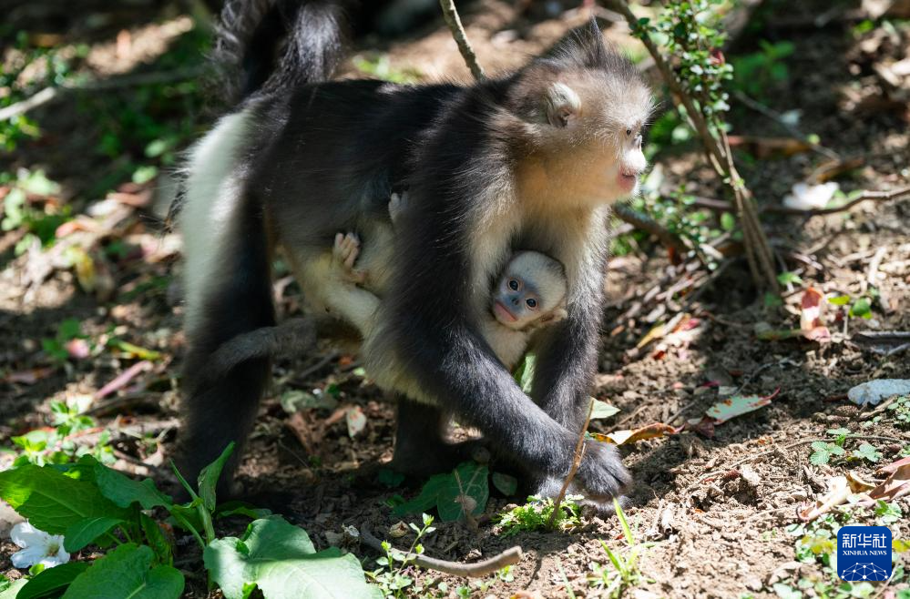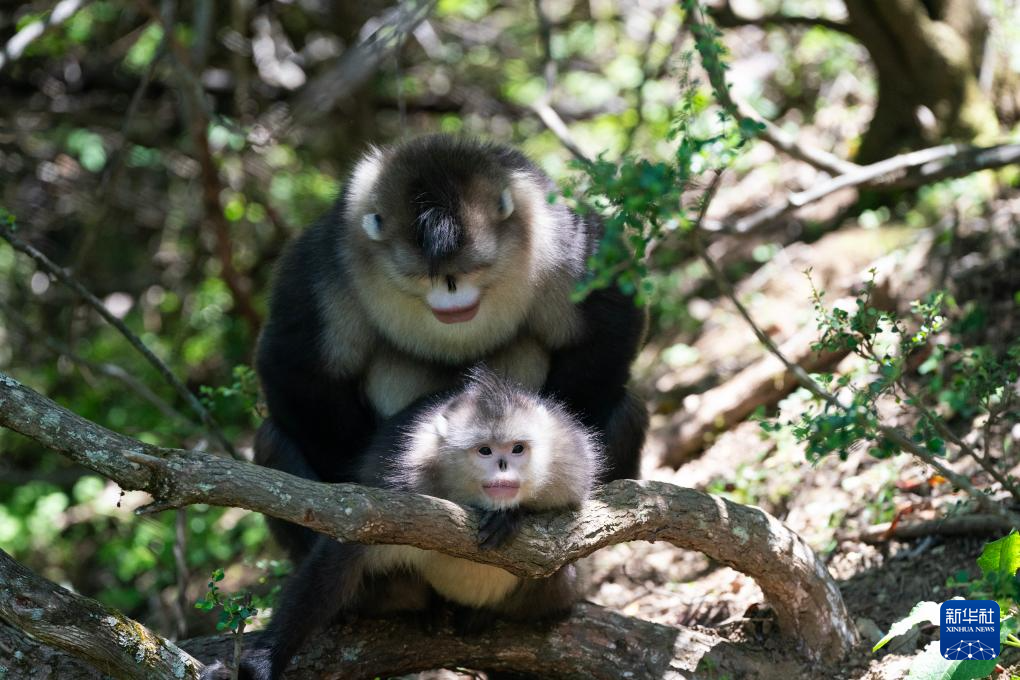 5月23日,在白马雪山国家级自然保护区响古箐片区内,一只滇金丝猴在照看幼崽。