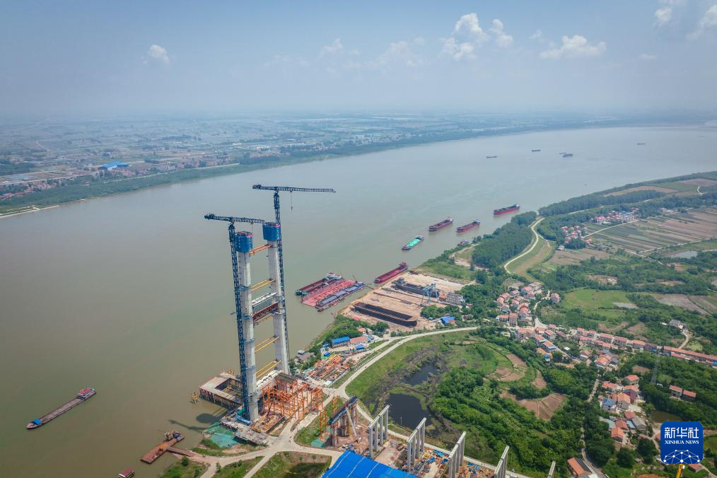这是在湖北省鄂州市拍摄的新港高速公路双柳长江大桥南主塔施工现场(5月24日摄,无人机照片)。