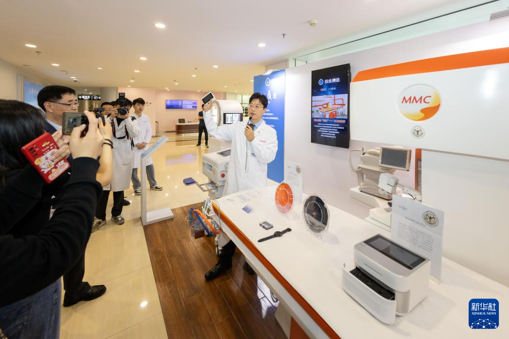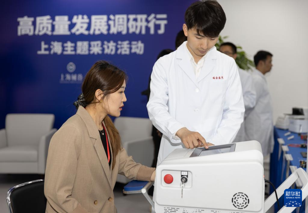 5月24日,一名记者在位于上海市嘉定区的上海械谷创新医疗器械产业园瑞金创新中心展示区体验无创血糖仪。