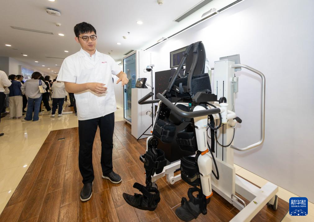 5月24日,在位于上海市嘉定区的上海交通大学医学院附属瑞金医院肿瘤质子中心,工作人员介绍由瑞金医院医生和医疗公司共同研发的用于恢复患者下肢的医疗机器人。