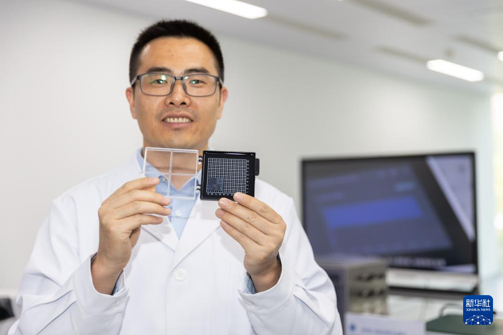 5月24日,在位于上海市嘉定区的上海交通大学医学院附属瑞金医院肿瘤质子中心,上海交通大学医学院附属瑞金医院医学芯片研究所所长陈昌在介绍用于无创血糖仪的芯片。