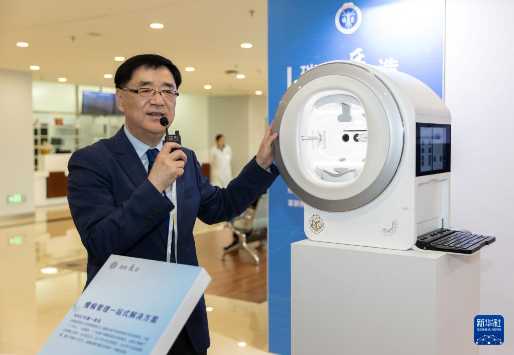 5月24日,在位于上海市嘉定区的上海交通大学医学院附属瑞金医院肿瘤质子中心,中国工程院院士、瑞金医院院长宁光在介绍一台自动眼征测量仪。