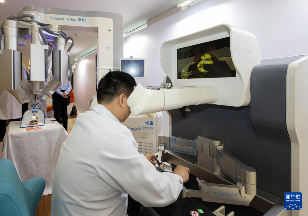 5月24日,在位于上海市嘉定区的上海交通大学医学院附属瑞金医院肿瘤质子中心,工作人员演示使用手术机器人剥蛋壳,该手术机器人用于帮助医生更好地进行精细化医疗手术。
