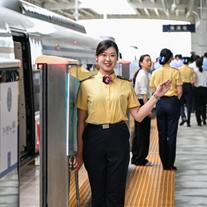 5月26日,广州地铁乘务人员在城际铁路番禺站合影留念。