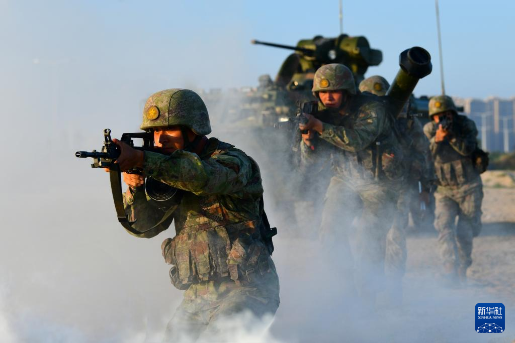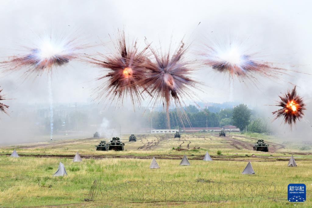 演练中,陆军某合成旅“杨根思连”步战车在烟幕弹掩护下发起战斗冲击(2023年7月29日摄)。
