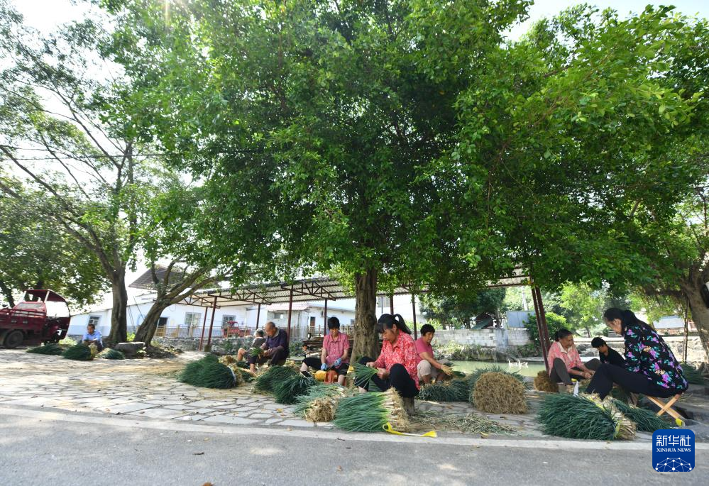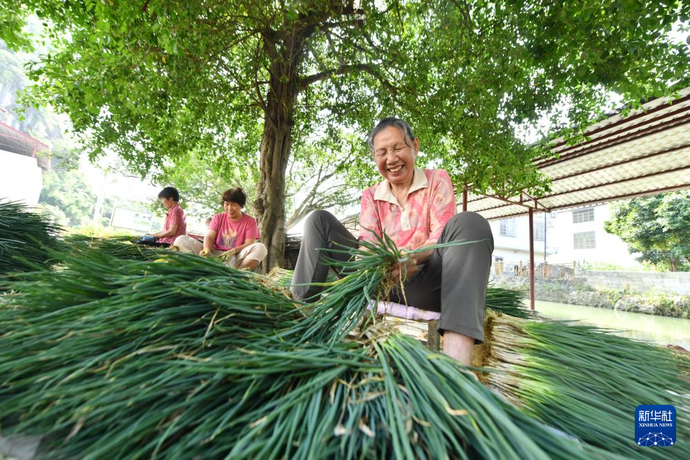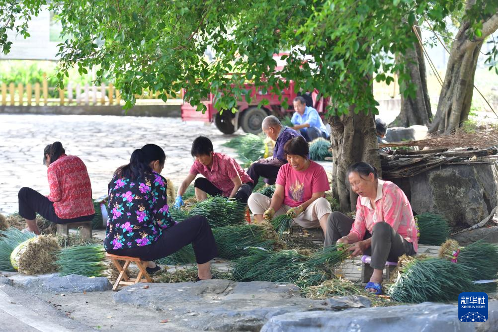在柳州市柳江区三都镇觉山村,村民们在挑选香葱(5月23日摄)。