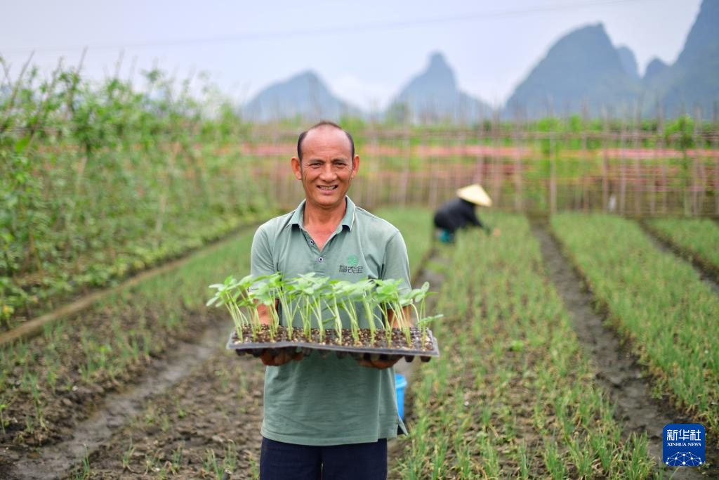 在柳州市柳江区三都镇觉山村,村民韦初满准备种植黄瓜(5月15日摄)。