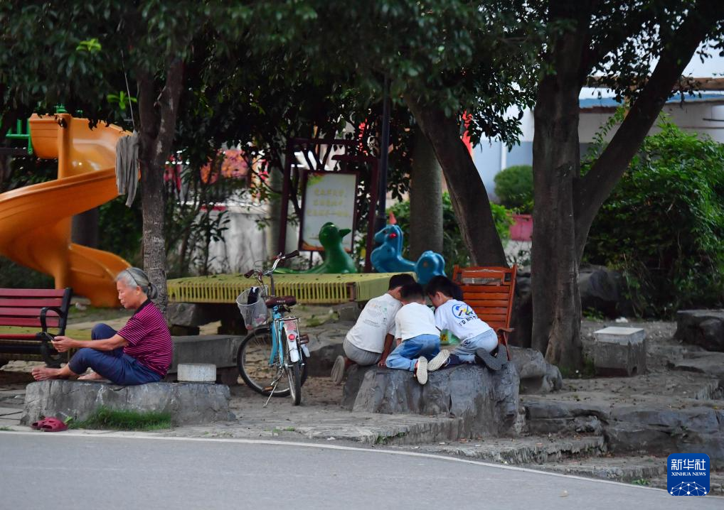 在柳州市柳江区三都镇觉山村,小朋友在树下玩耍(5月23日摄)。