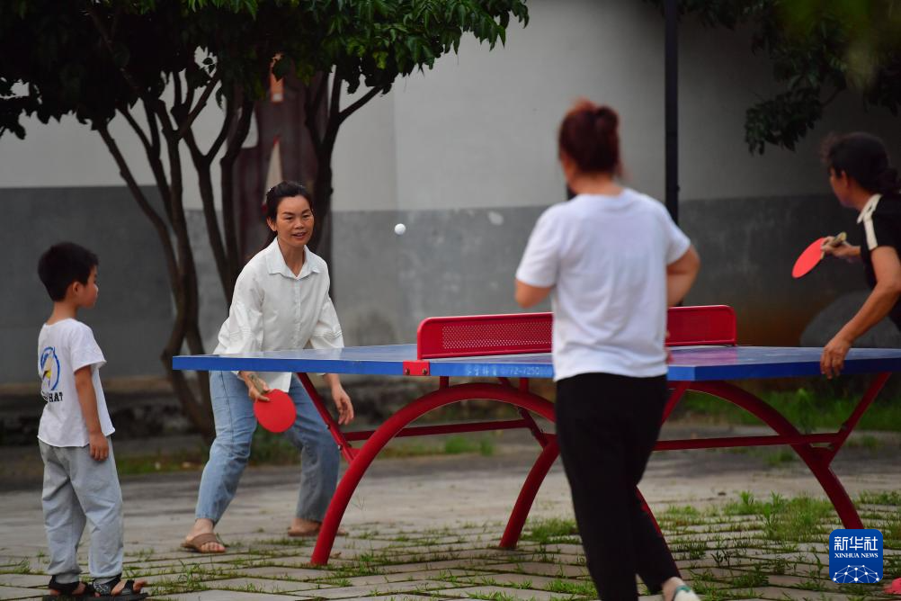 在柳州市柳江区三都镇觉山村,村民在小广场上打乒乓球(5月23日摄)。