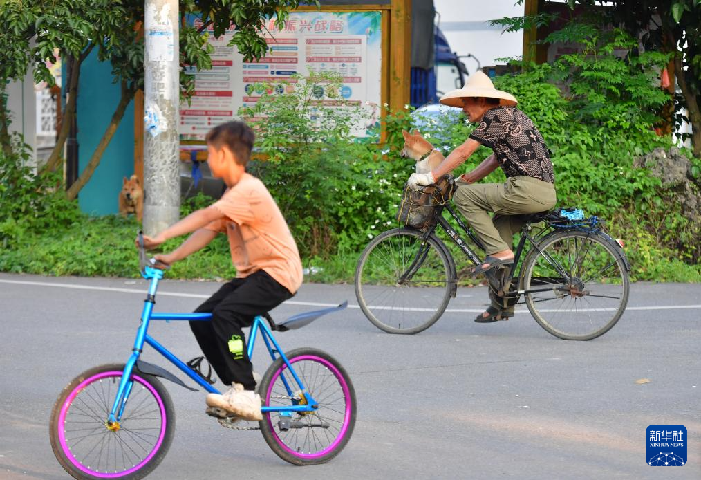 村民在柳州市柳江区三都镇觉山村的村道上骑行(5月23日摄)。