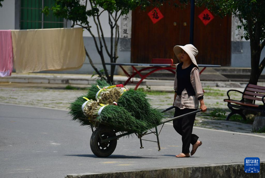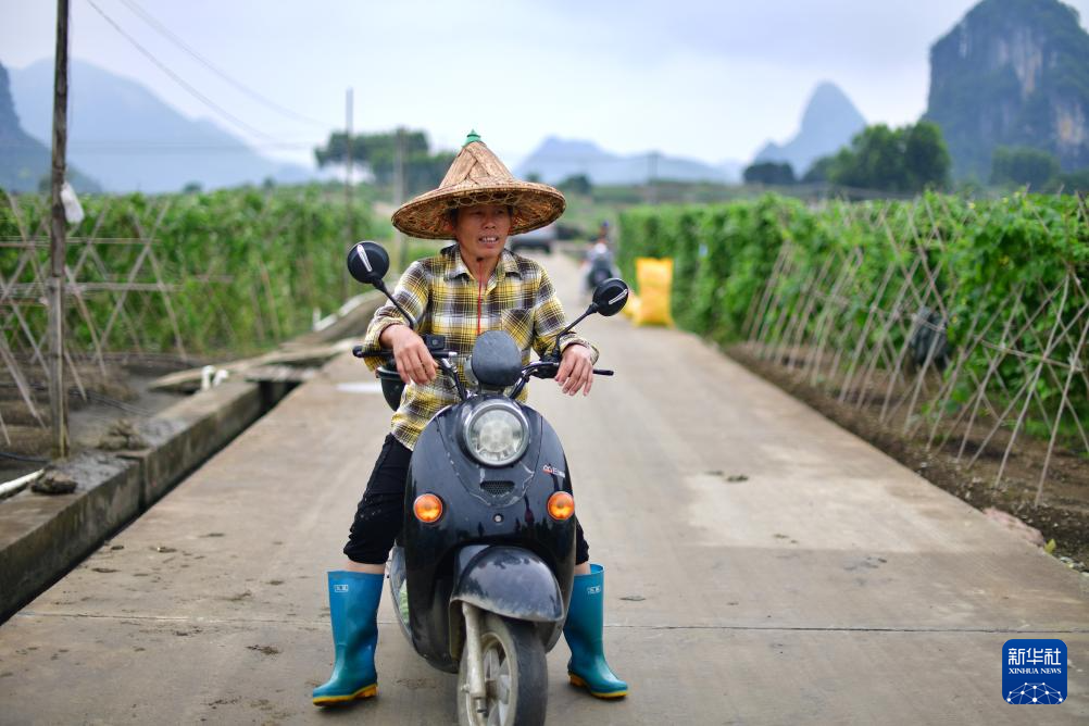 在柳州市柳江区三都镇觉山村,结束劳作的村民准备回家吃午饭(5月15日摄)。