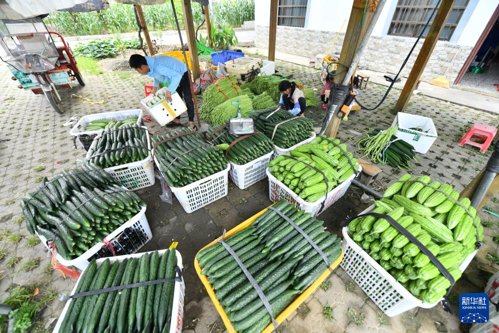 在柳州市柳江区三都镇觉山村,村民在打包蔬菜,准备供应市场(5月25日摄)。
