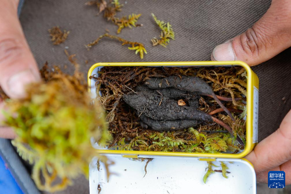 当地居民在四川省甘孜藏族自治州康定市沙德镇的草山上挖到虫草后,将其垫上其他植物保存在盒子里(5月23日摄)。