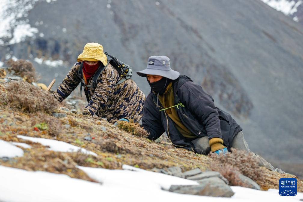 沙德镇瓦约村村民扎西旺吉(右)和妻子德吉在四川省甘孜藏族自治州康定市沙德镇的草山上寻找虫草(5月23日摄)。