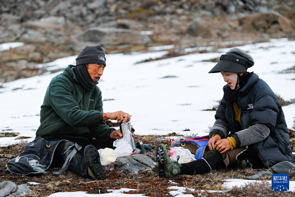 沙德镇沙德村村民尼玛拉姆(右)和哥哥扎西旺秋在四川省甘孜藏族自治州康定市沙德镇的草山上挖虫草的间隙吃午饭,稍事休息(5月23日摄)。