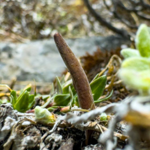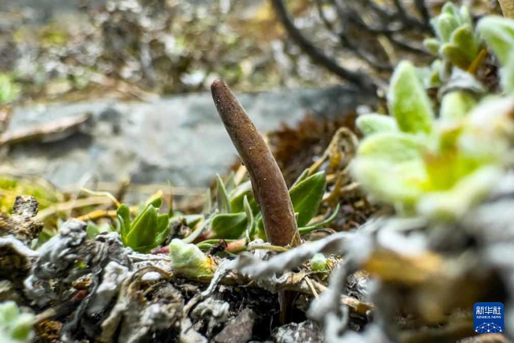 这是在四川省甘孜藏族自治州康定市沙德镇的草山上拍摄的虫草露出地面的子座(5月23日摄)。