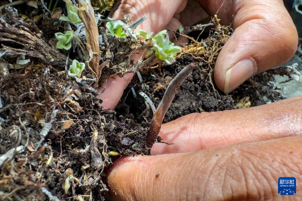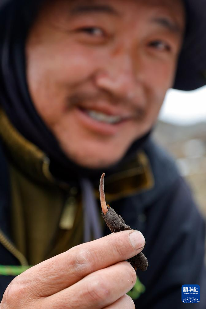 沙德镇瓦约村村民扎西旺吉展示其在四川省甘孜藏族自治州康定市沙德镇的草山上挖到的虫草(5月23日摄)。