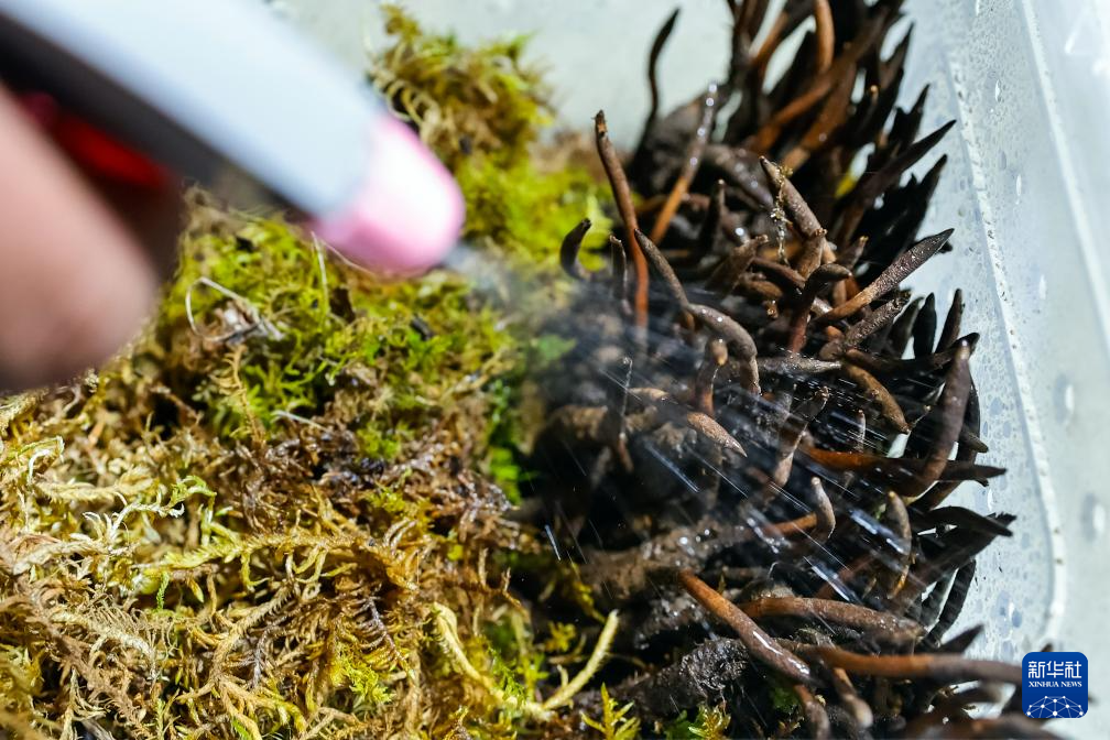 在四川省甘孜藏族自治州康定市沙德镇,一名商贩在为收购的鲜虫草喷水保湿(5月22日摄)。