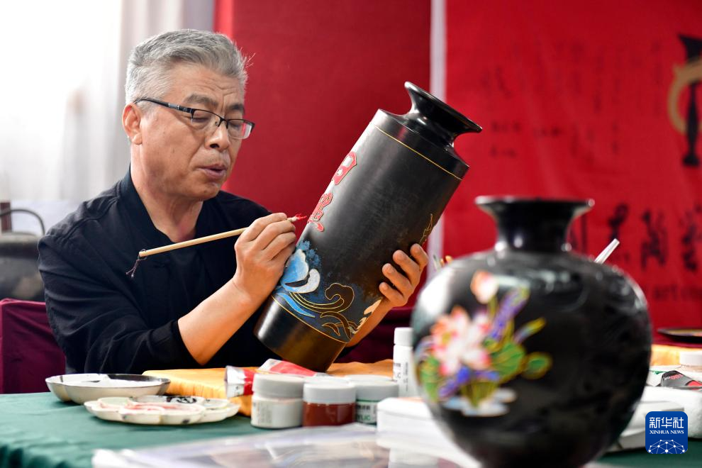 5月26日,在日照黑陶邢艺术厂,省级非遗传承人邢葆东在修复黑陶。