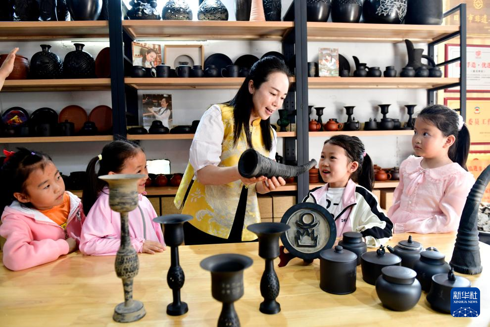 5月26日,在日照高新区慧敏非遗工作室,市级非遗传承人秦慧敏给孩子们介绍黑陶文化。