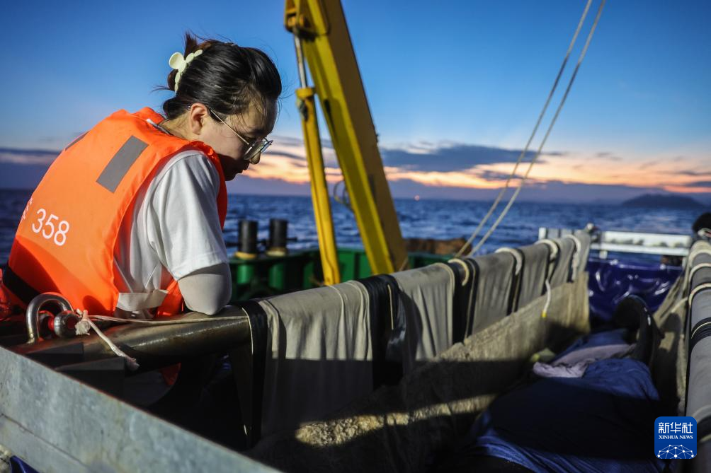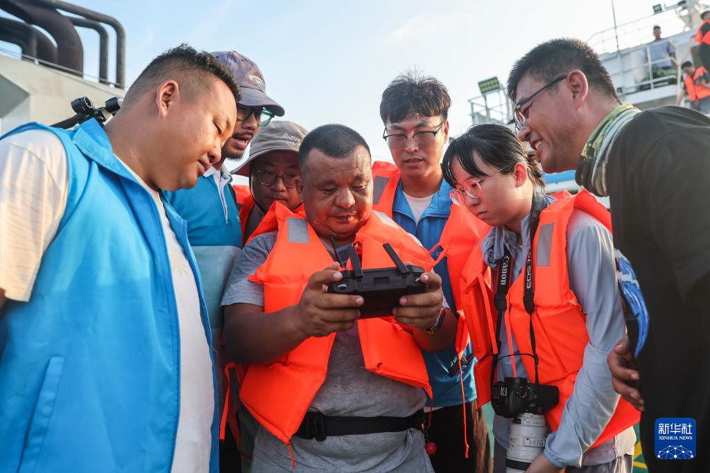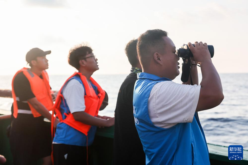 5月25日,在“利洋358”科考船上,志愿者在观察短肢领航鲸“海棠”的状态。