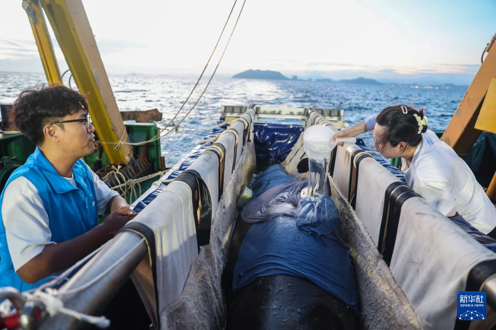 5月25日,在“利洋358”科考船上,志愿者和保育员给短肢领航鲸“海棠”浇水降温。