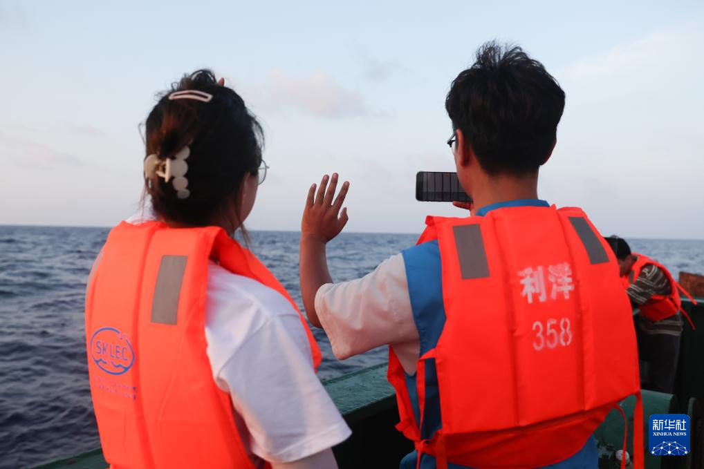 5月26日,在“利洋358”科考船上,志愿者和保育员向海里的短肢领航鲸“海棠”挥手告别。