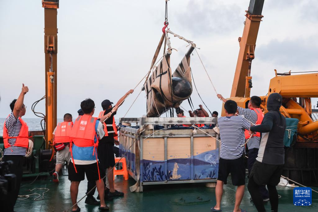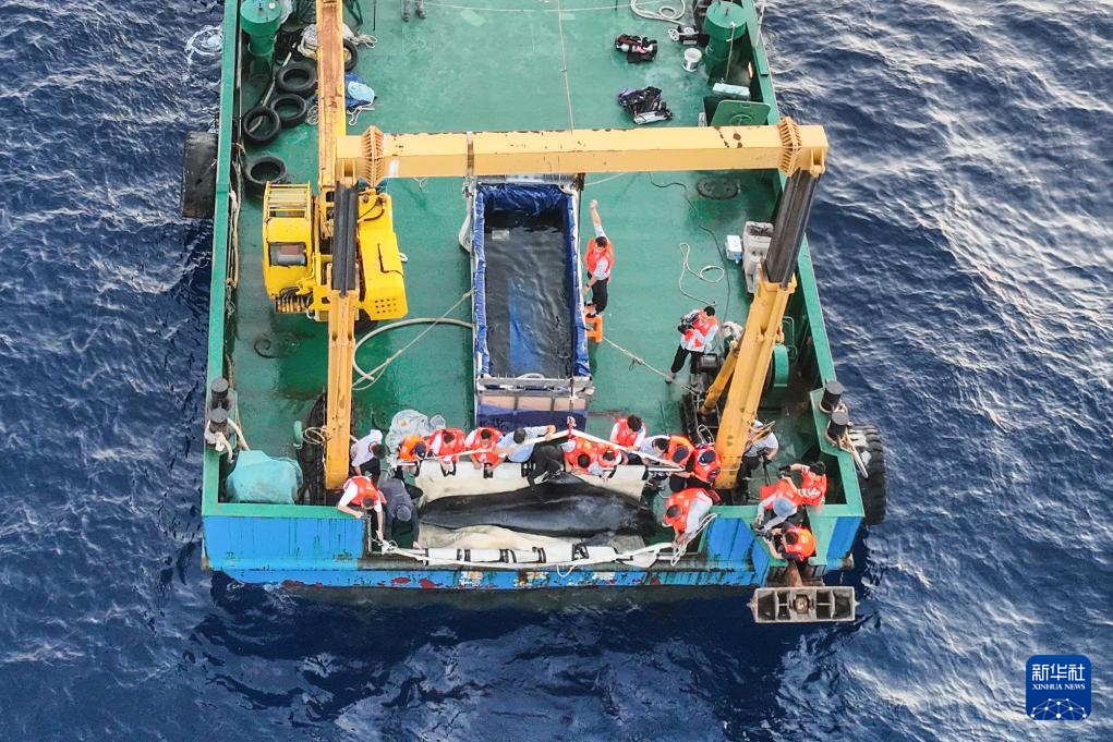 5月26日,在“利洋358”科考船上,短肢领航鲸“海棠”被吊起。