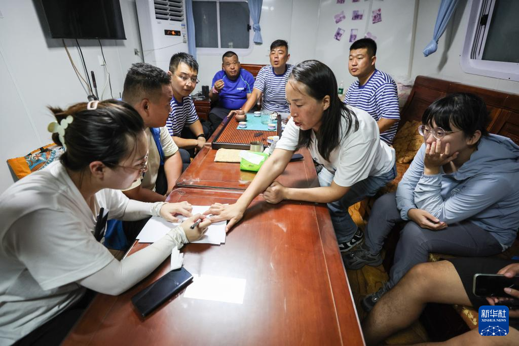 5月25日,“利洋358”科考船上,多家组织机构的工作人员在放归前夜反复确认放归方案。