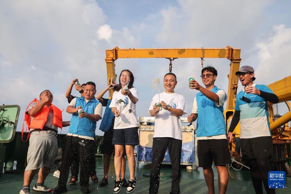 5月26日,在“利洋358”科考船上,短肢领航鲸“海棠”被成功放归大海后,大家欢呼庆祝。