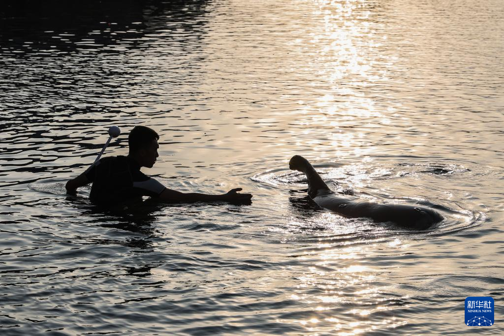 1月21日,在三亚海昌生物保育中心,短肢领航鲸“海棠”第一天进入室外的大水池,保育员在水中观察它的状态。