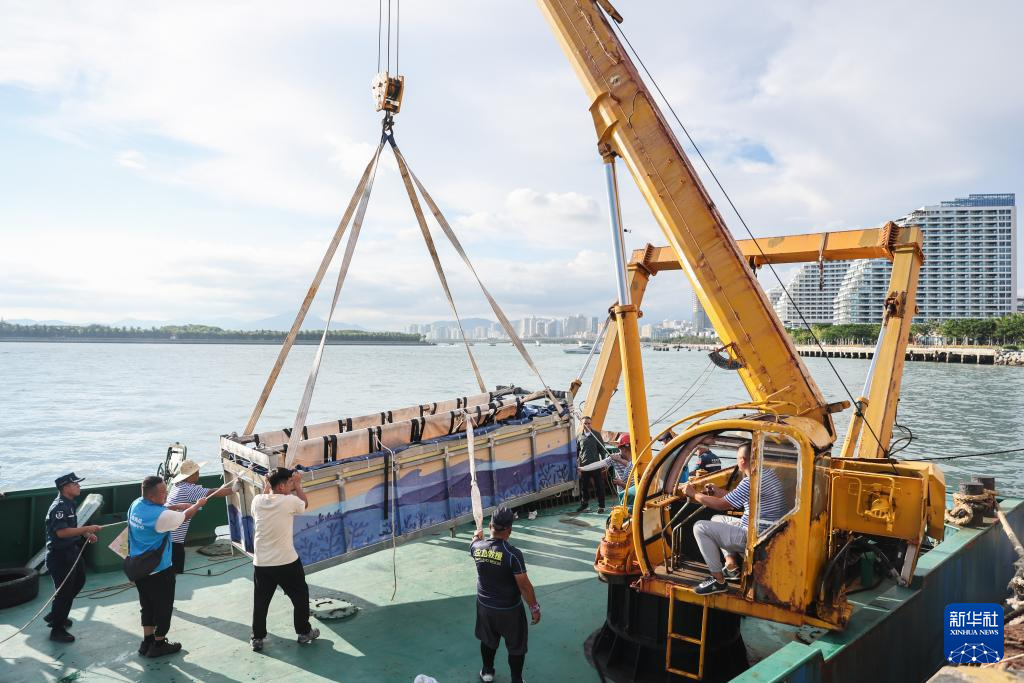 5月25日,在三亚港务局码头,短肢领航鲸“海棠”被吊运到“利洋358”科考船上。