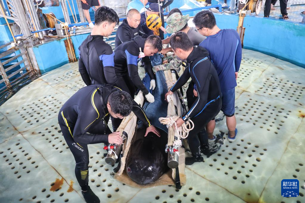 5月25日,在三亚海昌生物保育中心,潜水员用拉网准备转移短肢领航鲸“海棠”。