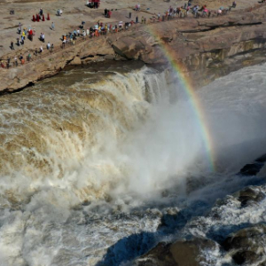 当日,受降雨影响,黄河壶口瀑布水量增大,河水翻滚而下,飞溅起的水雾在阳光的照射下,形成“彩桥通天”景观。