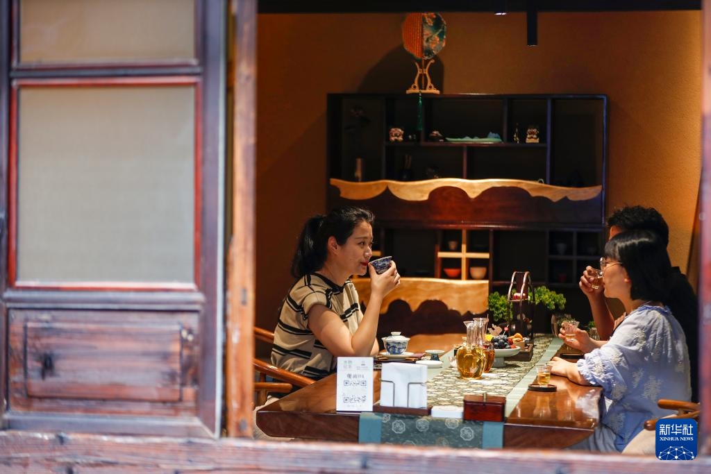 5月23日,在黄山市屯溪区一处茶空间,顾客品尝新式茶饮。 新华社发(施亚磊 摄)pagebreak