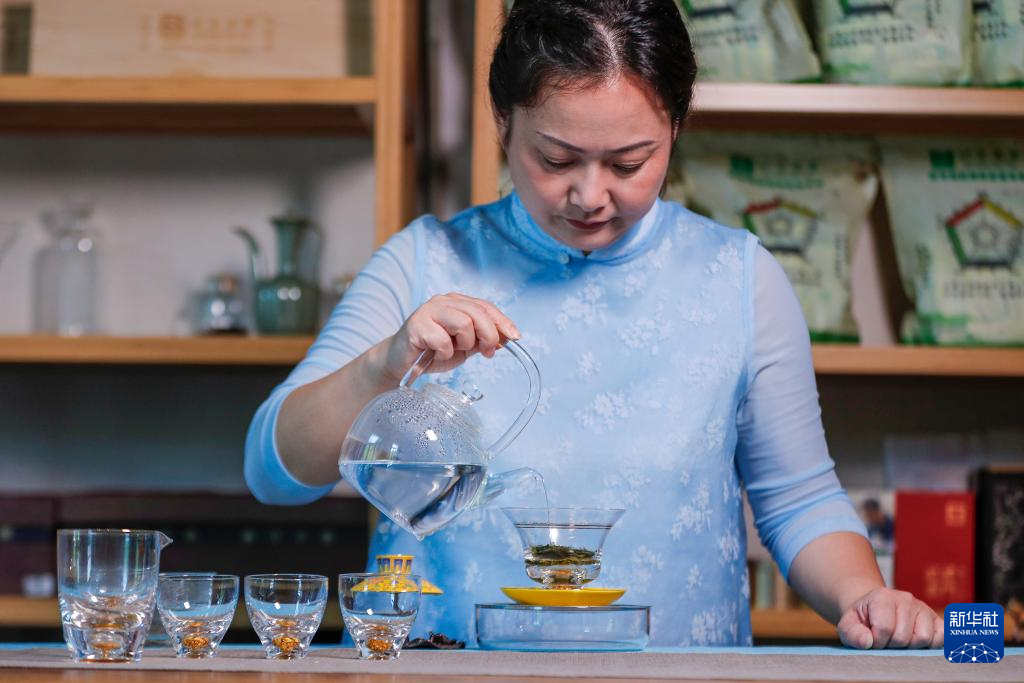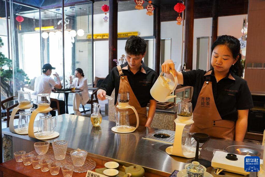 5月23日,在黄山市屯溪区一处茶空间,店员制作新式茶饮。 新华社发(施亚磊 摄)