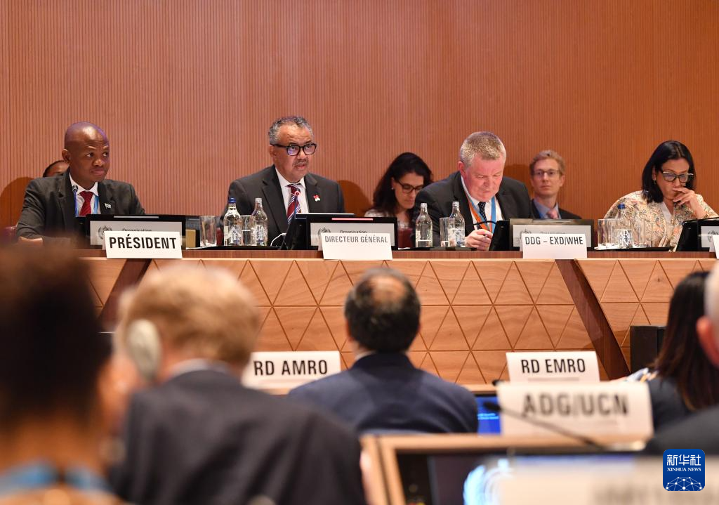 5月27日,在瑞士日内瓦,世卫组织总干事谭德塞(左二)在第77届世界卫生大会上致辞。