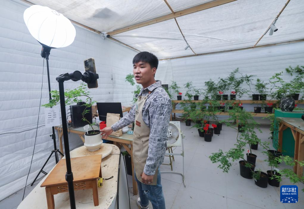 5月28日,在金华市金东区澧浦苗木城的苗圃里,新农人在直播销售花卉盆景。