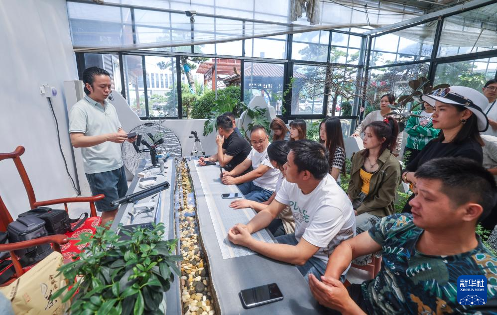 5月28日,在金华市金东区澧浦苗木城的苗圃内,浙江金华科贸职业技术学院的老师为培训学员讲解直播氛围调动技巧课。