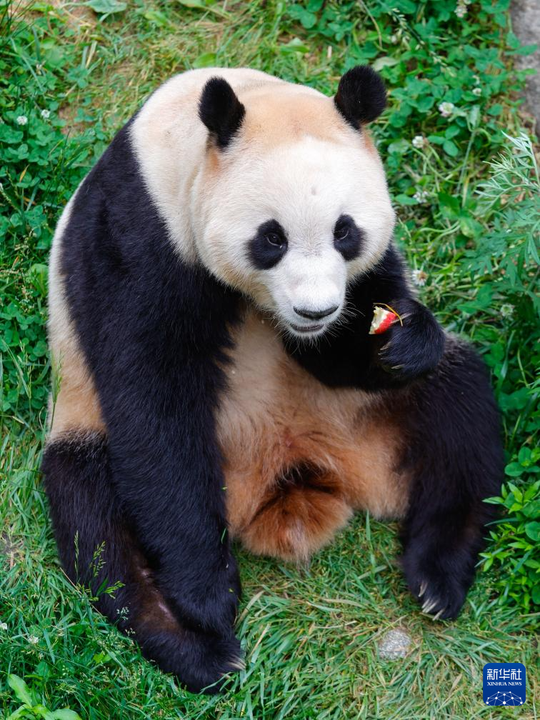 5月27日,大熊猫“福宝”在中国大熊猫保护研究中心卧龙神树坪基地的繁育园里吃苹果。