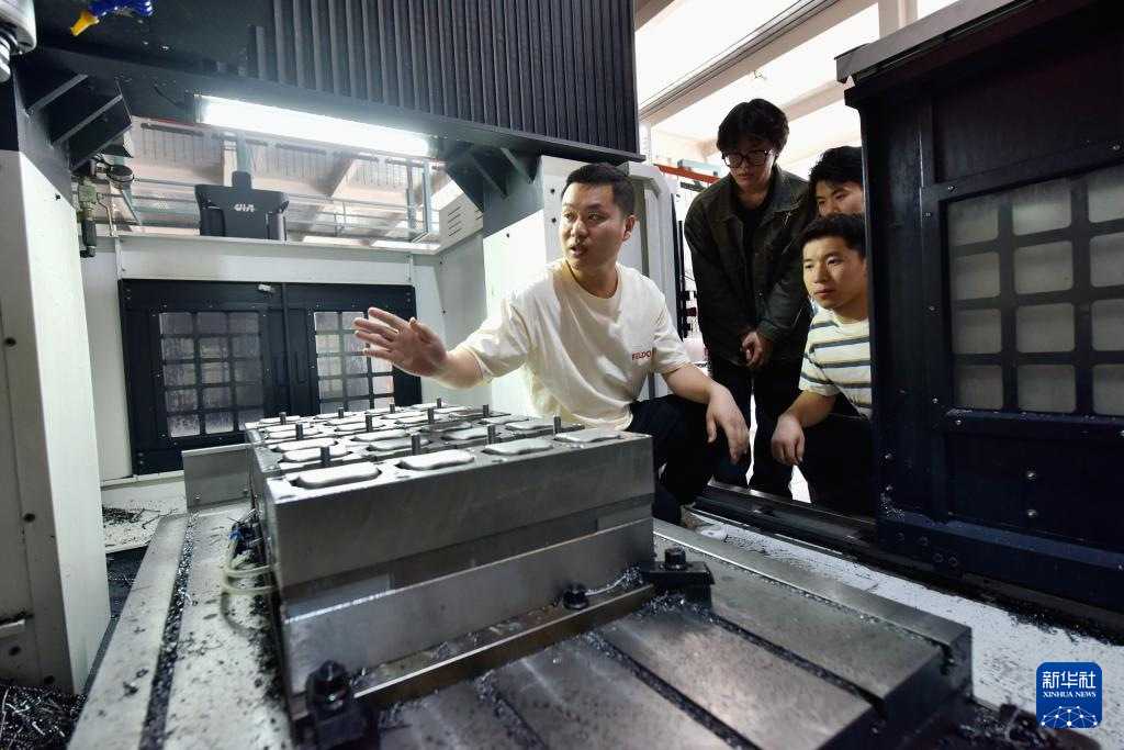 5月28日,在威县劳务品牌建设单位邢台威力汽车零部件有限公司,教师为学员讲解数控机床操作知识。