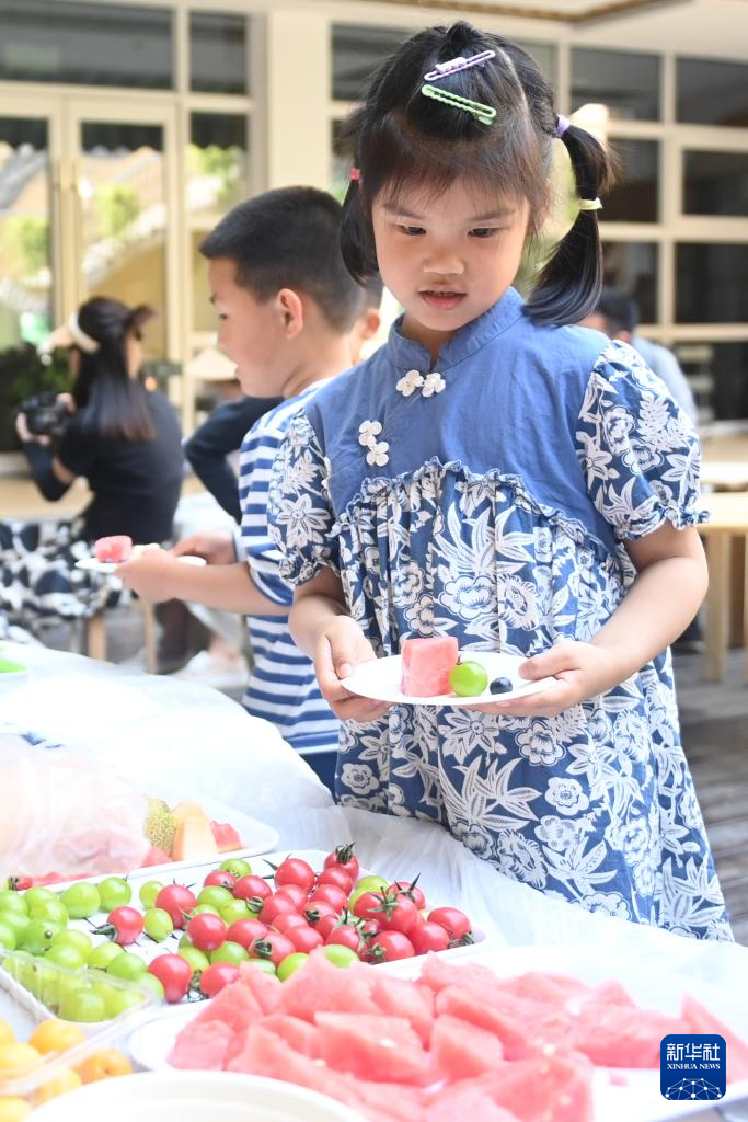 5月29日,杭州市锦绣幼儿园的小朋友在“美食集市”品尝水果。