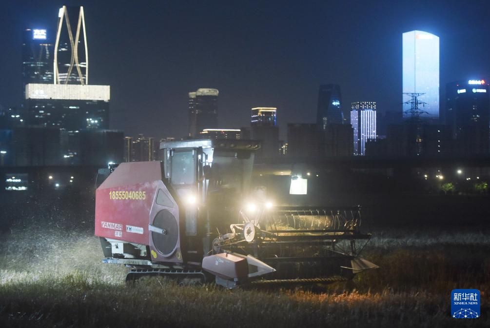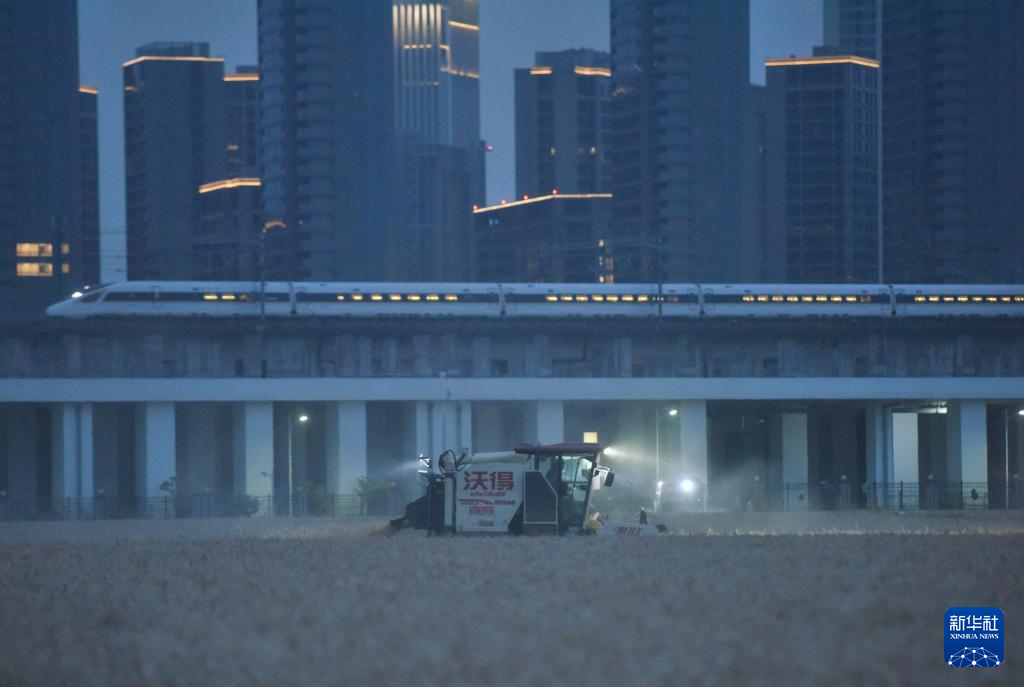 5月28日晚,农机手驾驶收割机在杭州市萧山区的一片麦田收获小麦。
