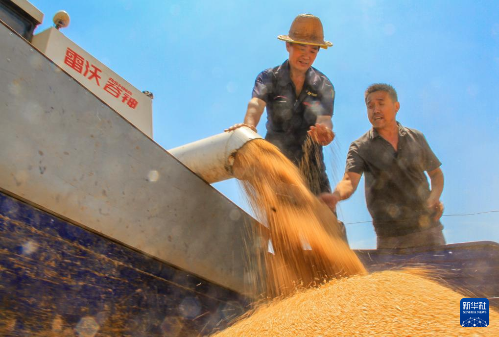 5月28日,在河南省商丘市夏邑县会亭镇郭吕庄村,村民在田间收获小麦。
