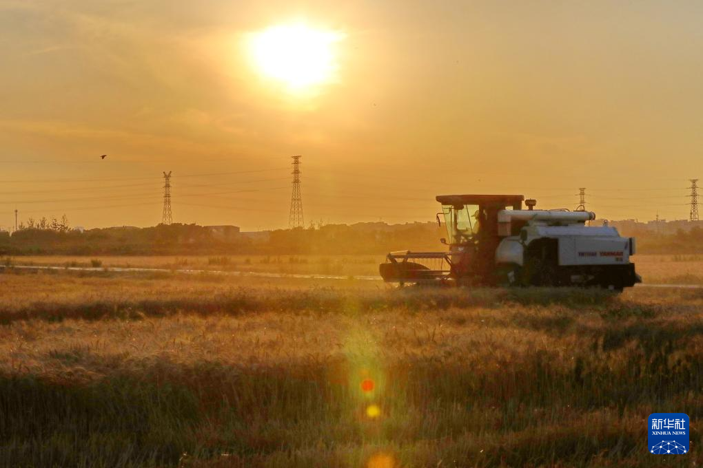 5月28日傍晚,在浙江省嘉兴市南湖区凤桥镇永红村,农机手驾驶收割机收获小麦。