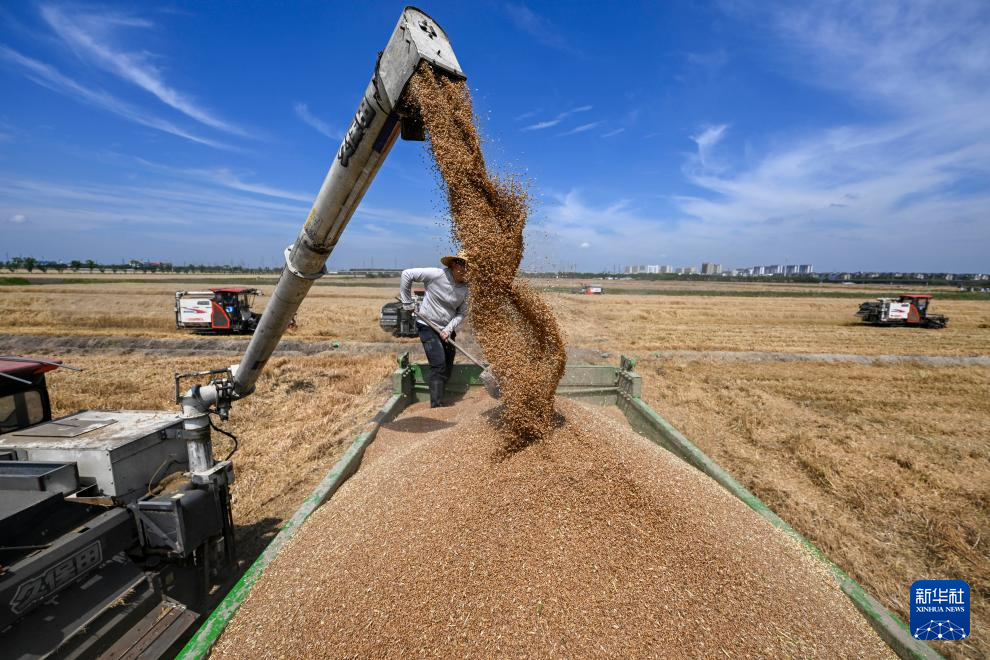 5月29日,农机在江苏省昆山市陆家镇未来智慧田园卸装小麦。