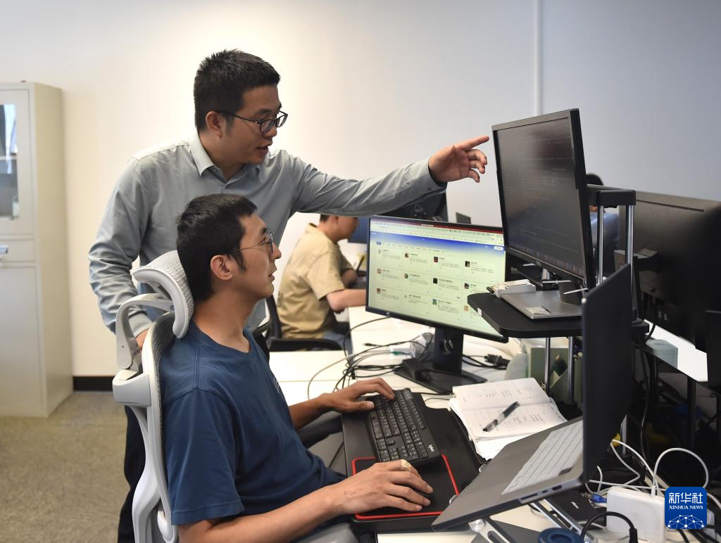 在北京三合智能科技有限公司,谷鹄翔(右)与测试人员江扬泽沟通“羿读”智能相机待机功耗测试样例(5月21日摄)。