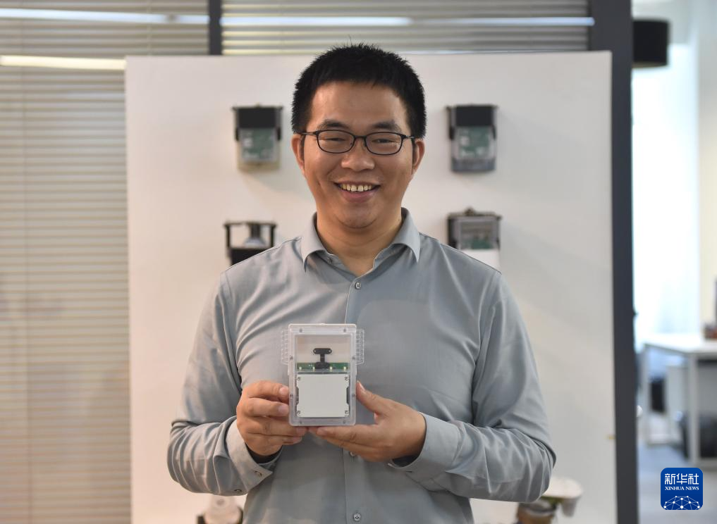 在北京三合智能科技有限公司,谷鹄翔展示团队研发的“羿读”智能相机(5月21日摄)。